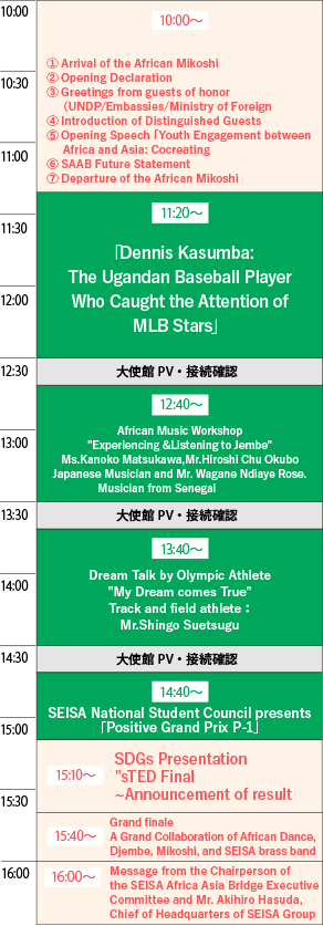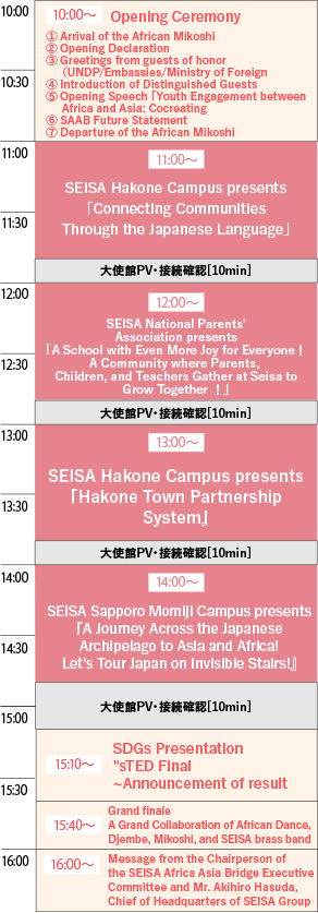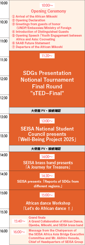 私たちSEISAの生徒は、アフリカとアジアの仲間と共に、「共生(Togetherness)」の理念のもと、持続可能で平和な社会の実現を目指して行動することをここに宣言します。