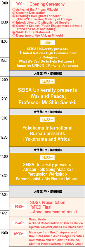 We, the students of SEISA, together with our friends in Africa and Asia, hereby declare our commitment to act under the philosophy of “Togetherness,” striving to realize a sustainable and peaceful society.